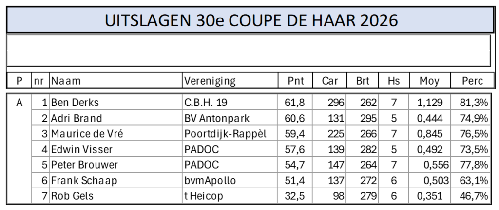 UITSLAG 30e COUPE DE HAAR – POULE A Geplaatst op 17-01-202619-01-2026 door Arjan Swinkels Geplaatst in Geen categorie.