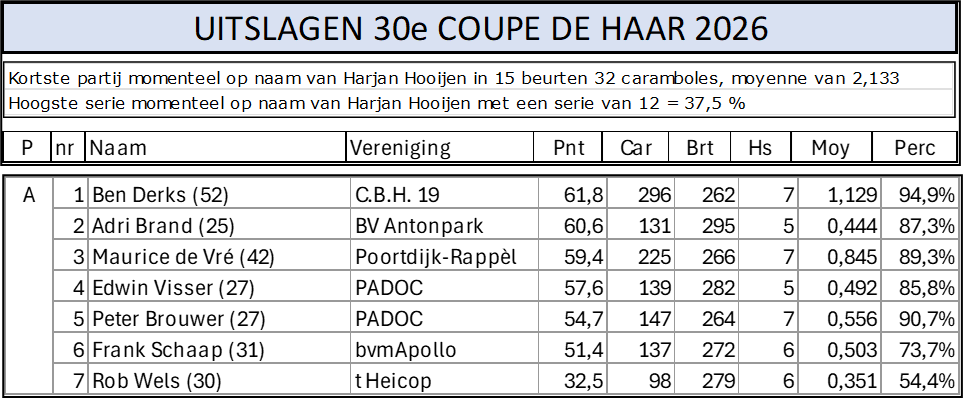 UITSLAG 30e COUPE DE HAAR – POULE A Geplaatst op 17-01-202608-02-2026 door Arjan Swinkels Geplaatst in Geen categorie.
