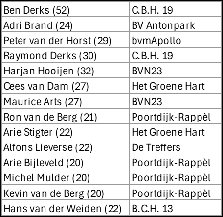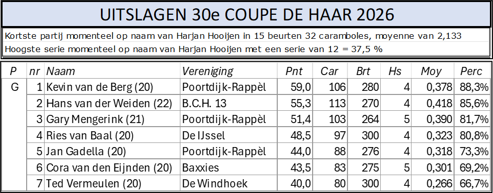 FINALISTEN 30e COUPE DE HAAR Geplaatst op 08-03-202608-03-2026 door Arjan Swinkels Dit is de uitslag van de laatste poule Dit zijn de spelers die op ZATERDAG 21 maart om 10:30 uur in de finale staan: Klik hier voor de volledige uitslag Geplaatst in Geen categorie.