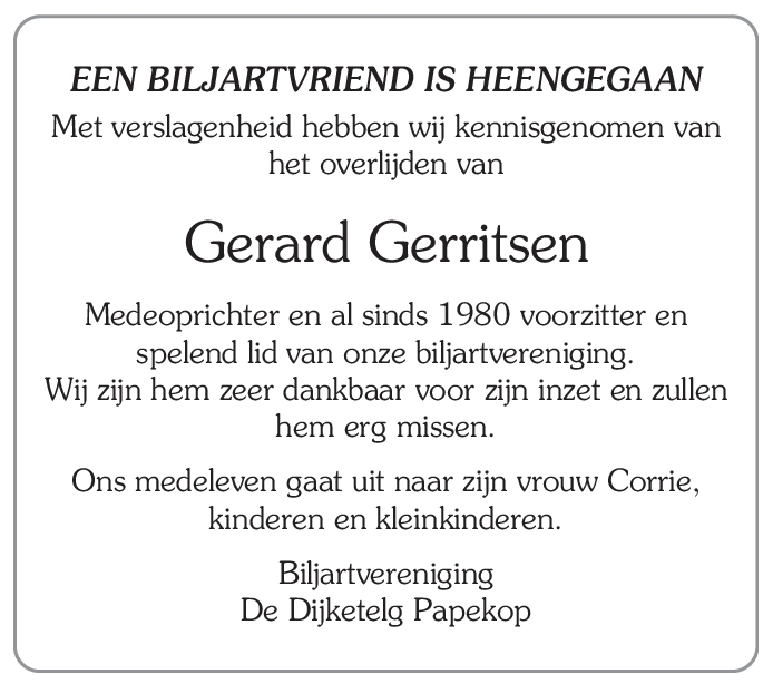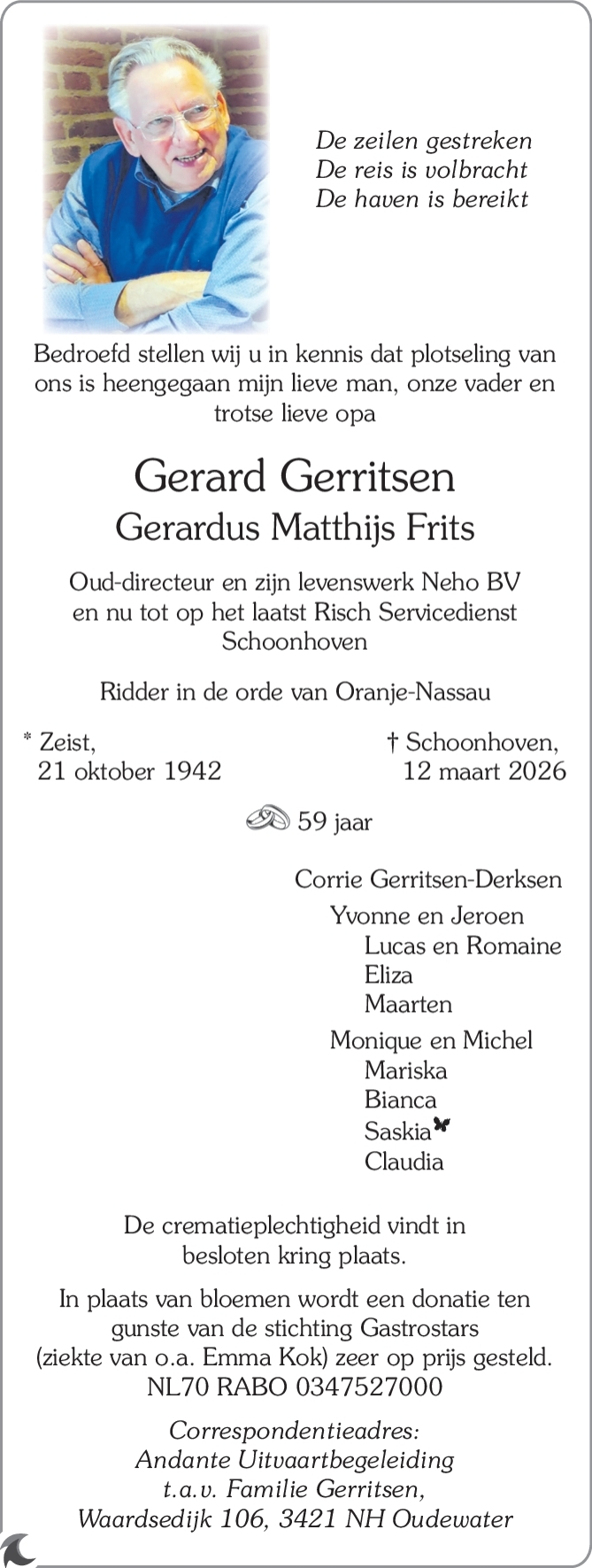 Op 12 maart is Gerard Gerritsen op 83-jarige leeftijd plotseling overleden.
